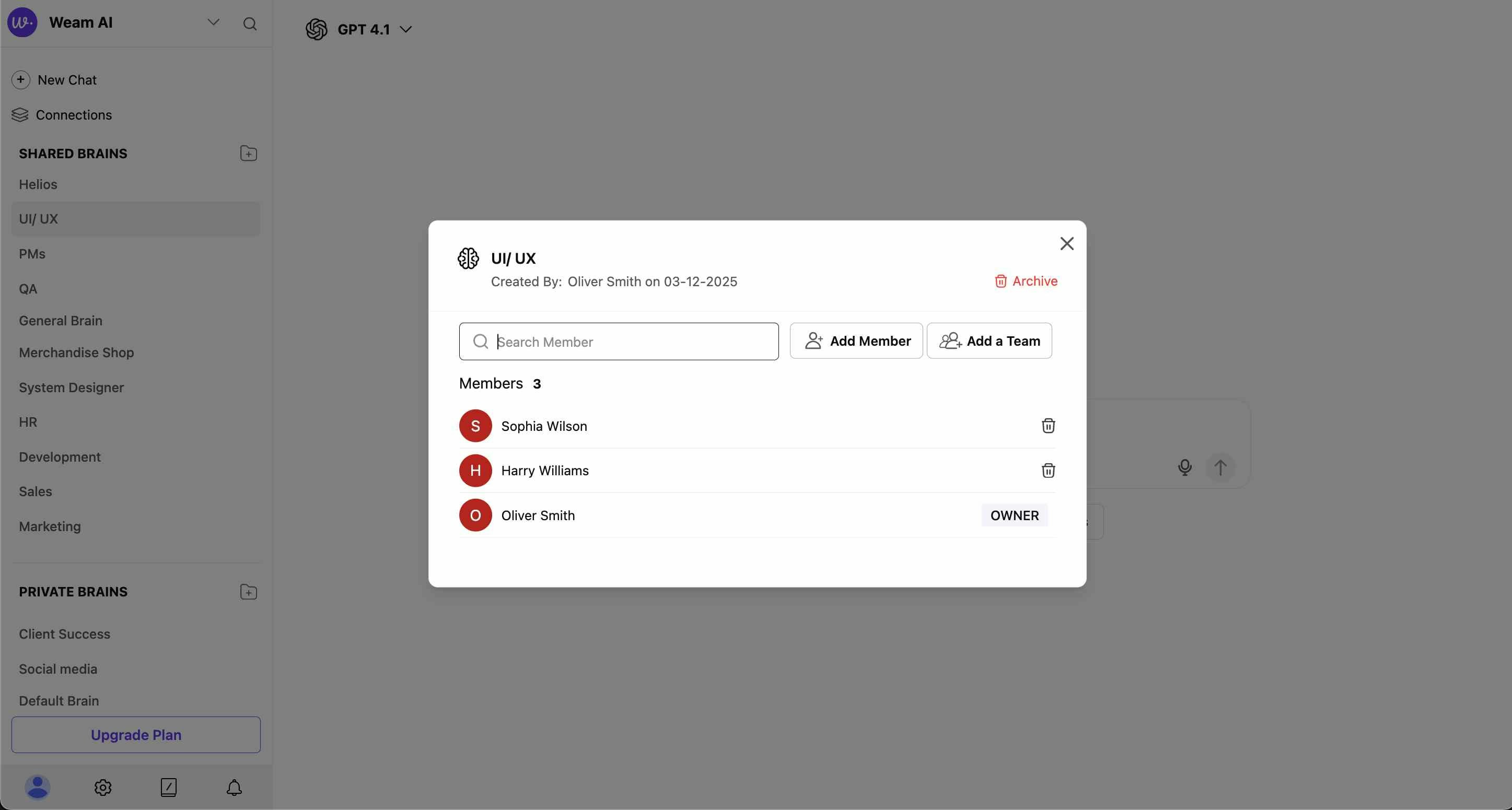 - Member Control: Add or remove team members from Shared Brains