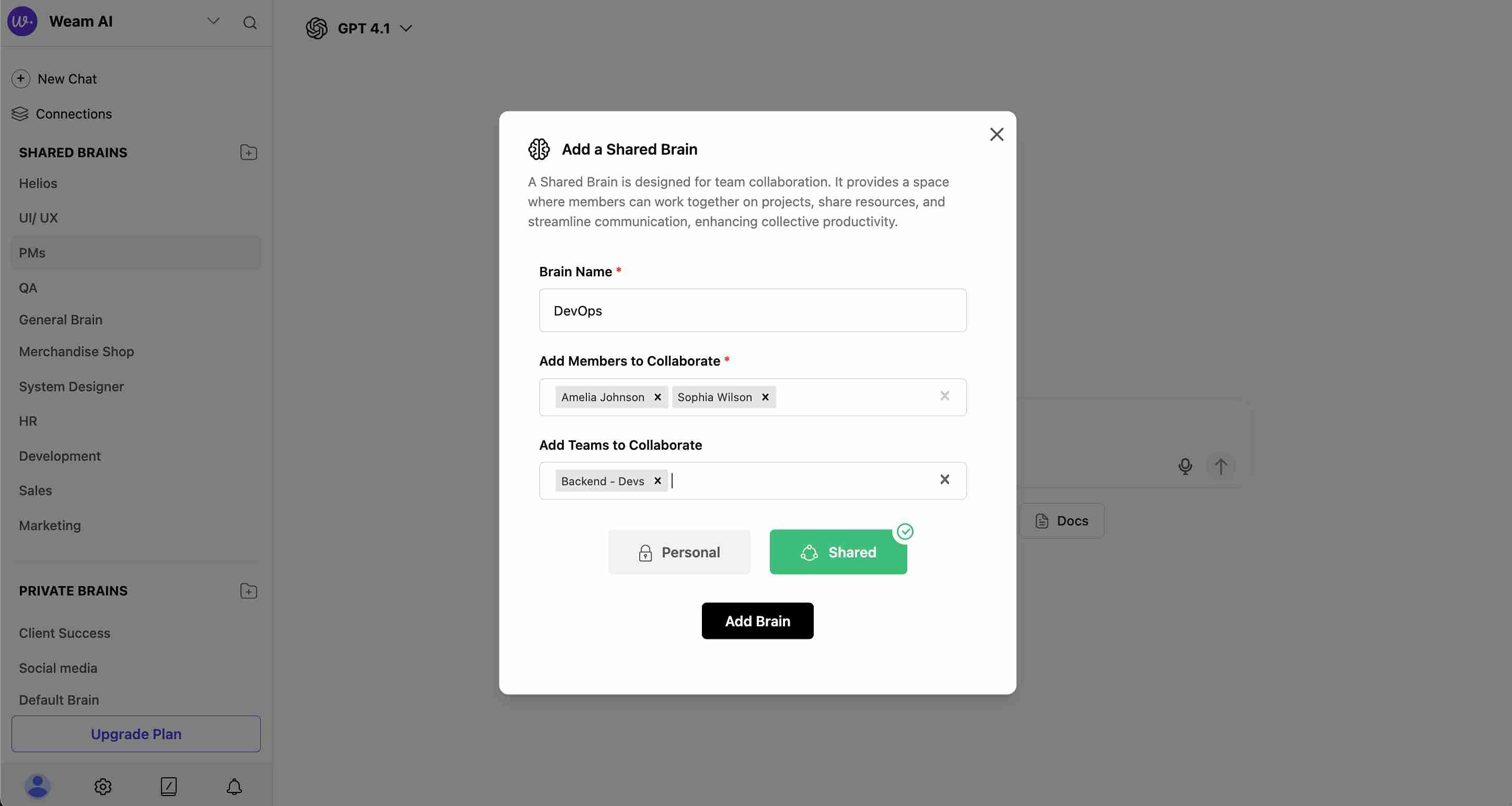 - Click “Add Brain” to create the Shared Brain